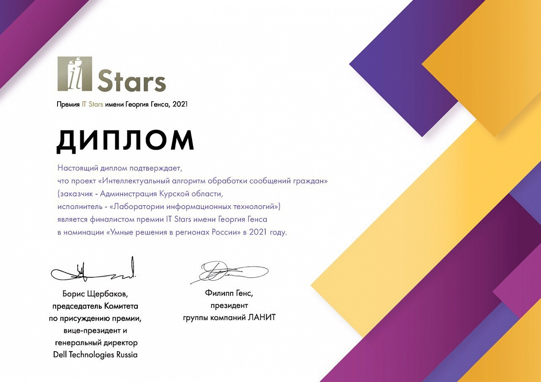 Проект «Интеллектуальный алгоритм обработки сообщений граждан» администрации Курской области в исполнении белгородской «Лаборатории информационных технологий» стал финалистом премии IT Stars имени Георгия Генса в номинации «Инновационный проект в госсекторе».