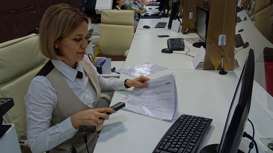 В зале обслуживания филиала №1 МФЦ по городу Курску и Курскому району комиссия проверила внедрение инструментов бережливого производства на рабочих местах в окнах приема-выдачи. Проверяющим на практике продемонстрировали работу терминала сбора данных в контрольно-аналитической службе. Терминал позволил перевести ручную работу в цифровой вид. Он находит документы по штрих-коду в электронном реестре и показывает их статус, что существенно ускорило работу и сократило время приема.