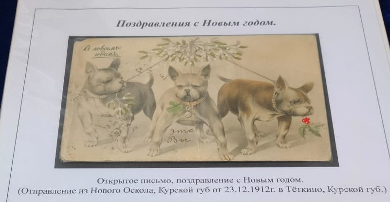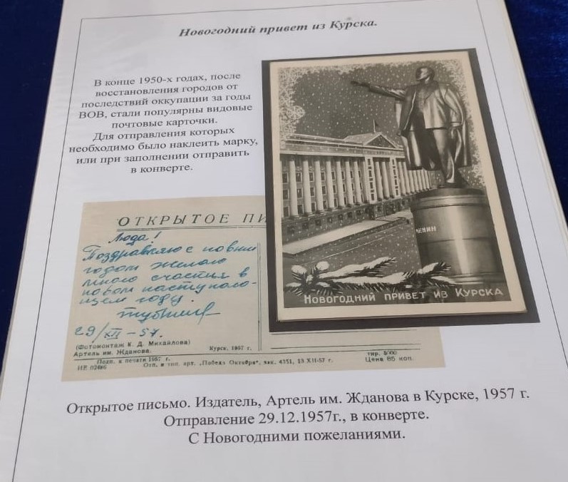 Среди наиболее ранних экспонатов — дореволюционная почтовая карточка, отправленная из Нового Оскола в Тёткино Курской губернии 23 декабря 1912 года. Кроме того, здесь есть видовая открытка 1957 года от курской Артели имени Жданова. На ней изображены здание Дома Советов, памятник В.И. Ленину и надпись: «Новогодний привет из Курска». Примечательно, что местоположение памятника на открытке отличается от действительного, его разместили лицом к зданию.