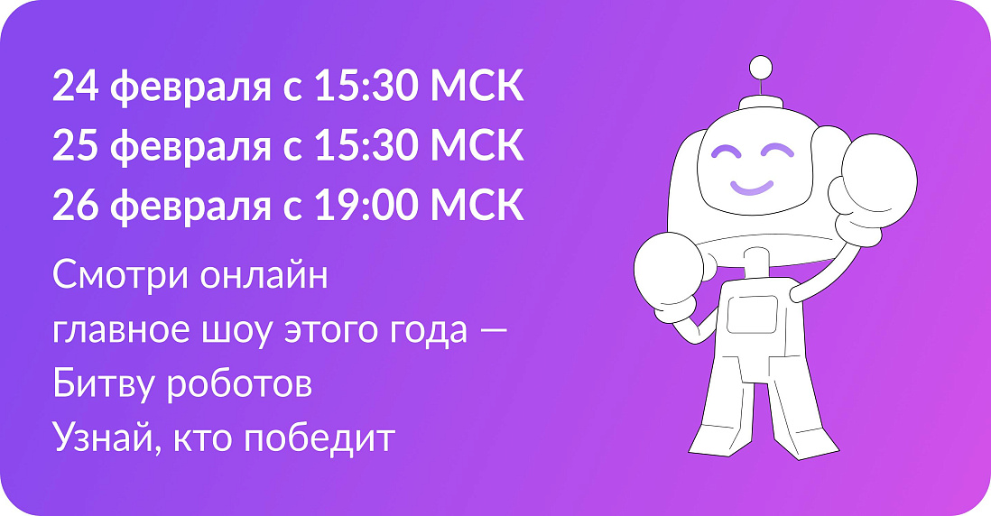 Подключиться к прямой трансляции «Битвы роботов» можно в социальной сети «ВКонтакте» по ссылке https://clck.ru/38pHZn.