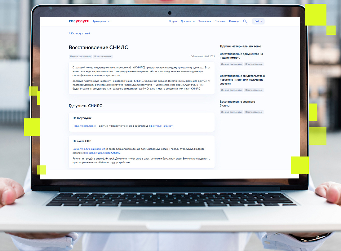 Восстановить СНИЛС стало проще, используя «Госуслуги». Физический носитель (зеленая карточка) больше не требуется, главное – знать сам номер СНИЛС. Развитие портала и цифровых сервисов проводится в соответствии с нацпроектом «Экономика данных».